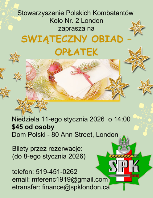 Stowarzyszenie Polskich Kombatantów Koło Nr. 2 London zaprasza na Świąteczny Obiad - Opłatek