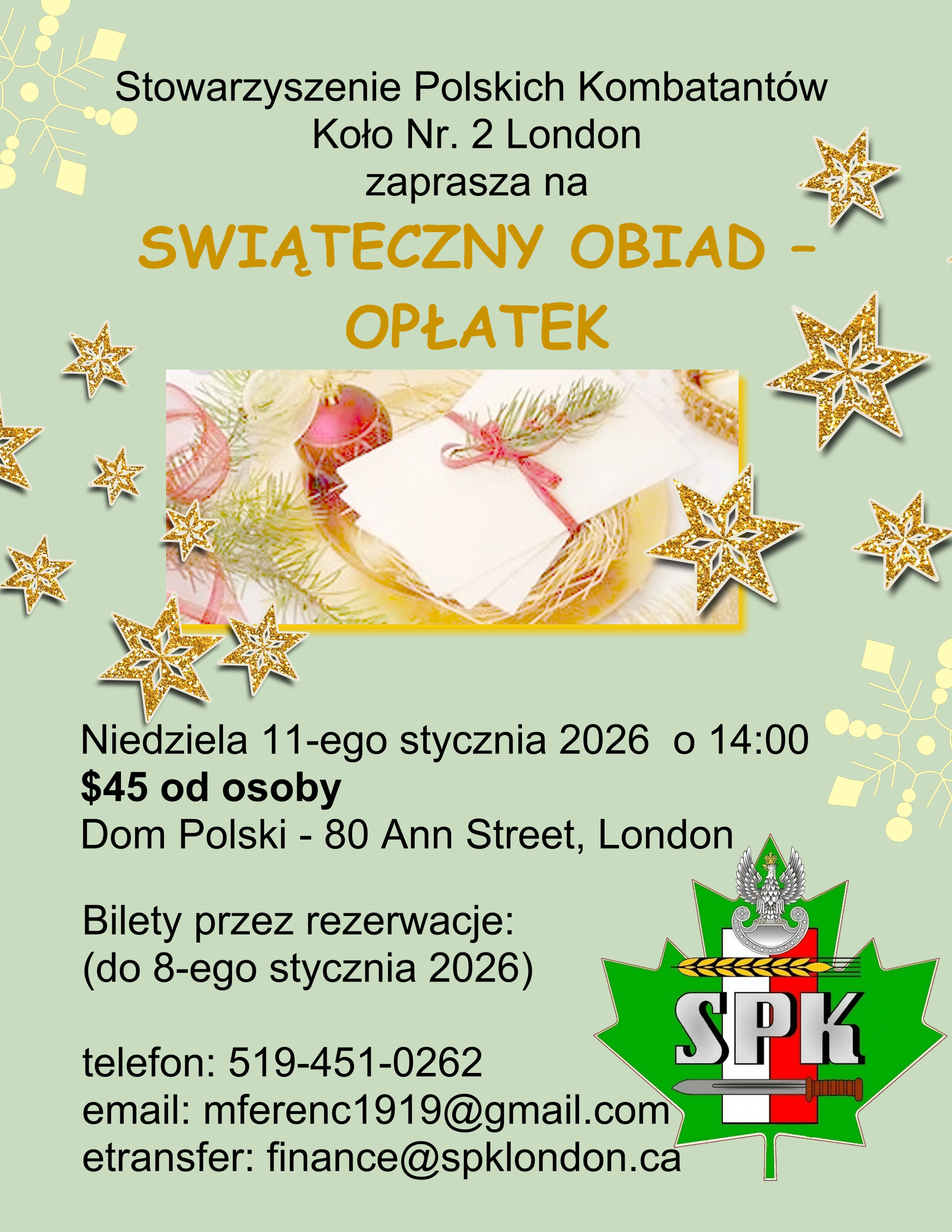 Stowarzyszenie Polskich Kombatantów Koło Nr. 2 London zaprasza na Świąteczny Obiad - Opłatek