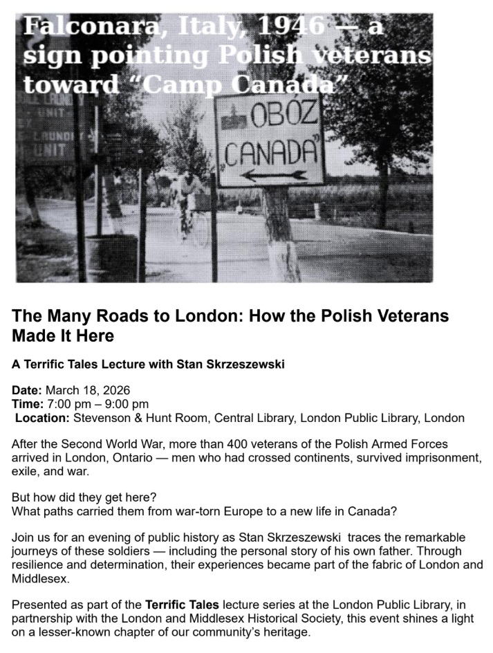 Discover the remarkable journeys of more than 400 Polish Armed Forces veterans who settled in London, Ontario after the Second World War. Through powerful storytelling — including a personal family story — this lecture explores a meaningful chapter of our local heritage.