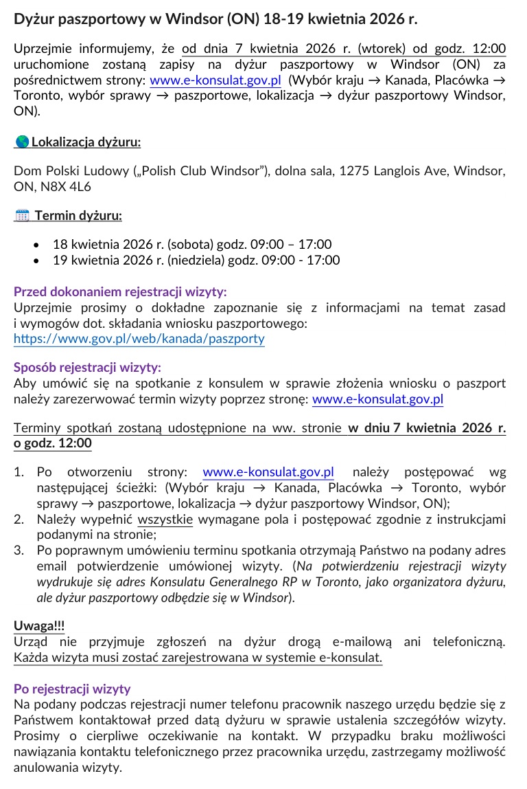 Przekazuję informację Konsulatu Generalnego RP w Toronto dotyczącą dyżuru paszportowego w Windsorze (Ontario), który odbędzie się w dniach 18–19 kwietnia 2026 r., w godzinach od 9:00 do 17:00 w Domu Polskim, 1275 Langlois Ave, Windsor.
